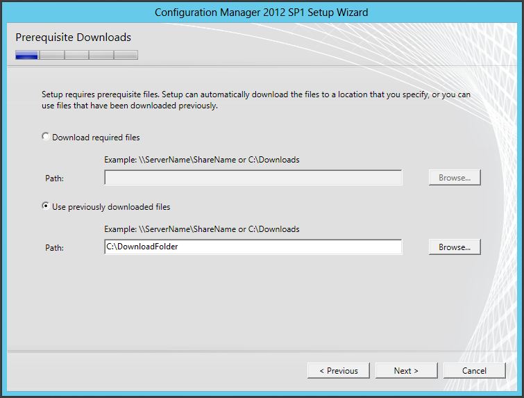 You should obviously replace ‘C:\DownloadFolder’ with the folder of your choice and you should see a whole load of cab files and executables amongst a few other files. You can then simply reference that folder during your installation of Configuration Manager like so…