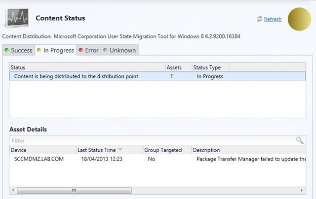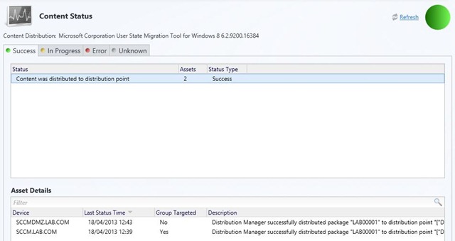 So you can see that it is looking for the content on it’s source DP, but I haven’t yet deployed it there. Now once I deploy the content to my source DP we should see the “In Progress” change to “Success”. You can either wait for the retry to kick in or redistribute the content to your pull DP.