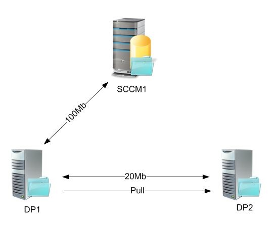 In this situation the link between DP1 and DP1 is better than the link between SCCM1 (Primary Site Server & DP) and DP2. Therefore with pull DP’s you can daisy chain off another DP like so…
