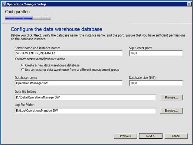This will then create the SQL data and log file correctly as OperationsManagerDW.mdf and OperationsManagerDW.ldf in the relevant locations.
