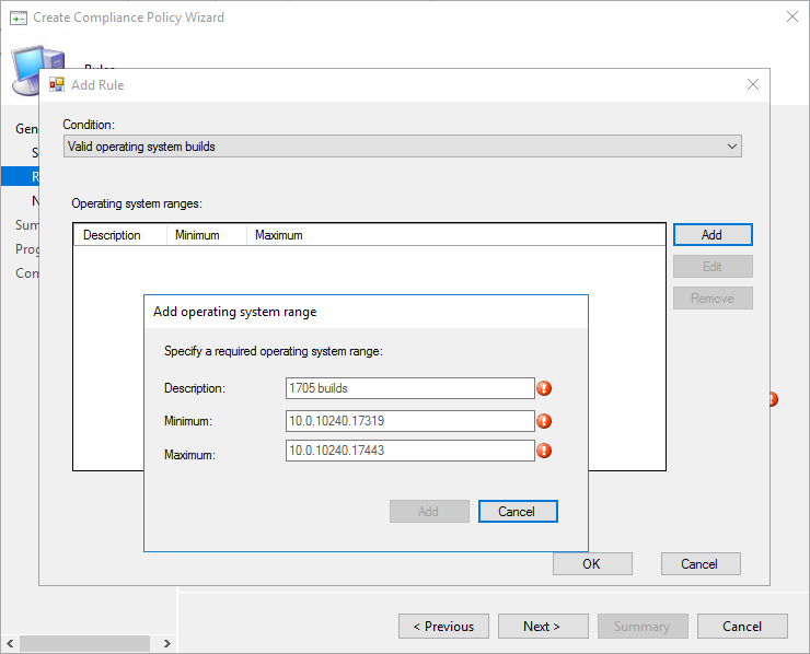 - Valid operating system builds. Specify minimum and maximum operating system build requirements.