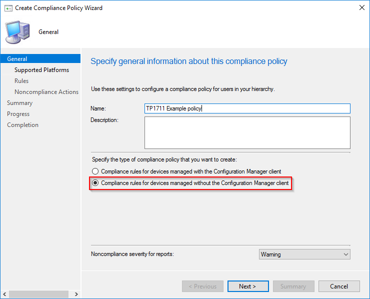 You need to give the policy a name and a description as you see fit. Ensure that you select “Compliance rules for devices managed without the Configuration Manager client” in order to see these new TP1722 Windows 10 options. Now hit Next.