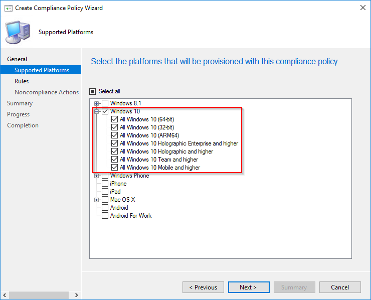 Now you may want to create a policy for multiple Operating Systems but for this example you should select the appropriate versions of Windows 10 that you require. Note that the list of Windows 10 versions is different from that if you were to select managed with a CM client. Hit Next again.