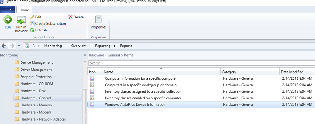 Along with the 20 other features included with Configuration Manager Technical Preview 1802 is a report which extracts the relevant information from your clients in order to use them with Windows AutoPilot. This collates the information from applicable Windows 10 machines (they must be 1703 or later) and the report can be found in the default reports under the Hardware – General section and is named “Windows AutoPilot Device Information”.