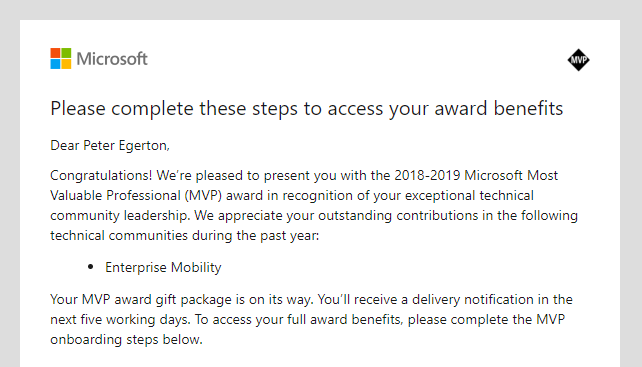I’m extremely pleased and happy to be able to announce that today (1st June 2018) I received an email to tell me that I have been awarded the Microsoft Most Valuable Professional award in Enterprise Mobility for 2018-2019.