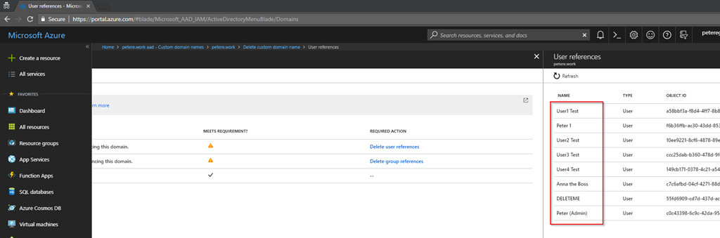 The only thing I wanted to take over was my domain name in Azure AD. But in this case as it’s a lab I seem to have mislaid the server I was using for Azure AD synchronisation during one of my many ‘playing around’ sessions. That, it seems, is a bit of a problem. In order to delete the domain name from my Azure AD I need to make sure there’s nothing reliant on it. I’d already switched my primary domain around so it was no longer my ‘vanity’ domain. But, in my case the users were synchronised from an AD using Azure AD Connect and I didn’t have any access to that AD Connect to ‘un-synchronise’ them.
