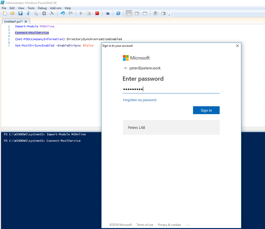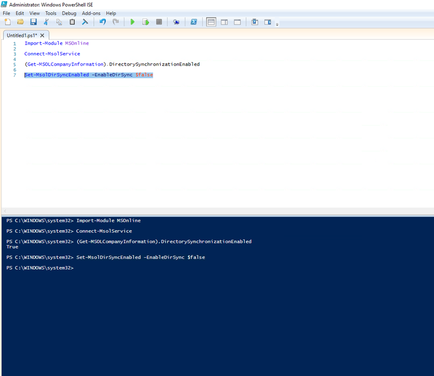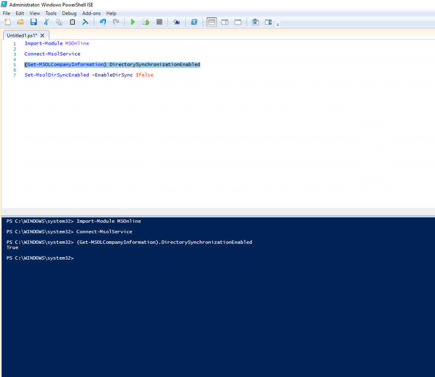 Now, as is often the case with Microsoft, all is not what it seems and you can do more in PowerShell than you can in the console. We have the capability to force a disable on directory synchronisation through the MSOnline PowerShell module. So here goes…