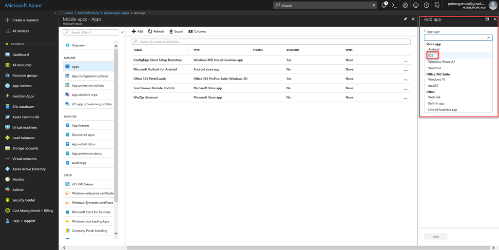 In the Add App blade, drop down the box and select the application type you wish to create. In this example we are using an iOS application as a store app.