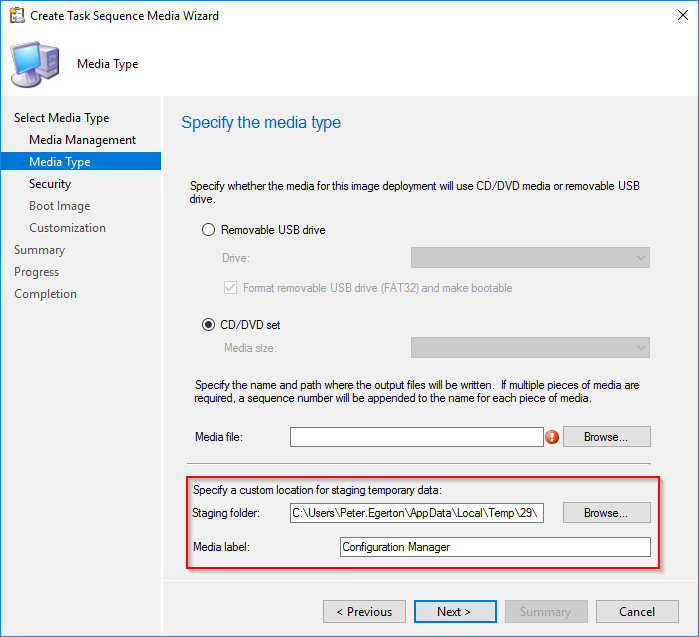 Task media creation got a little update which now allows to specify a staging area for the temporary data that is created during the media creation process. The default location is within appdata\local\temp of the users profile who is creating the media. This a very good addition as I have seen this cause issues in the past.
