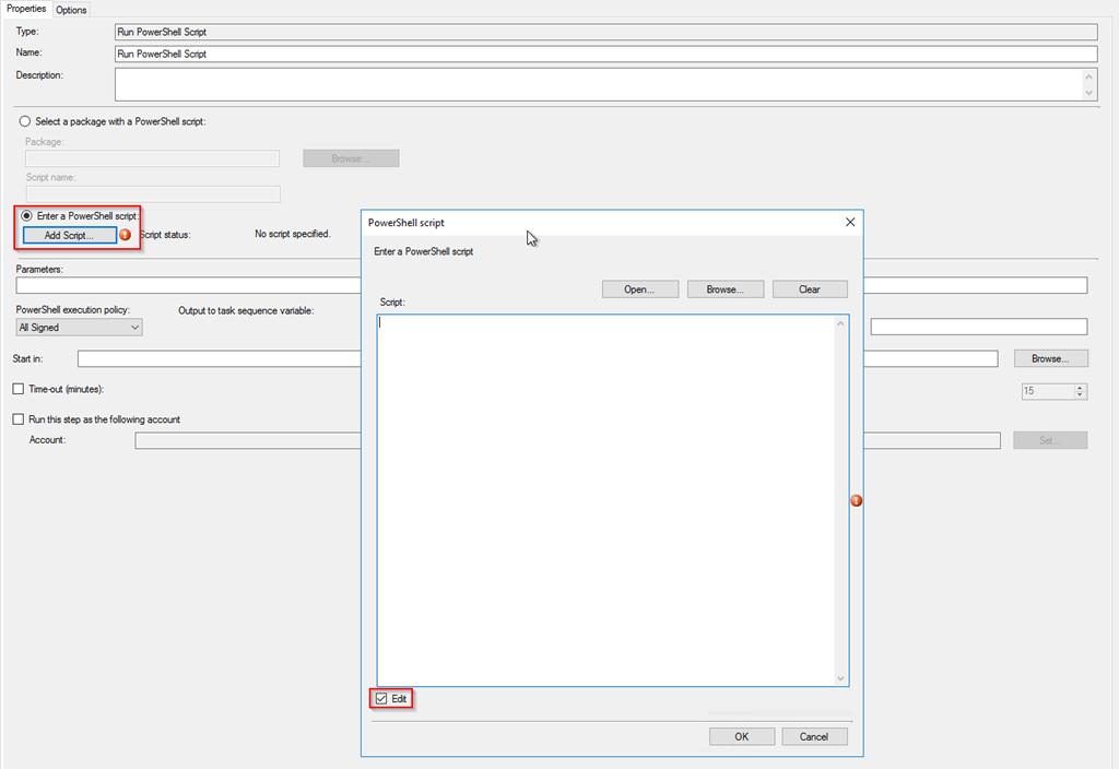 A number of additions have been made for running PowerShell scripts within a task sequence. First, we can now simply type, import or copy in a PowerShell script into the ‘Run PowerShell Script’ task without having to add the script to a package and distribute it etc. Whilst you can still do that, this allows more flexibility and does not require is to distribute the content which is handy. Note that you can also edit an existing script in this manner too, it’s not a static entry.