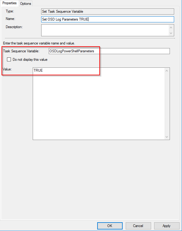 In addition to these features, if you wish to add your script parameters into the task sequence logging (SMSTS.log) then you must add a step prior to the Run PowerShell Script step, this will enable logging of the script parameters into your log files.