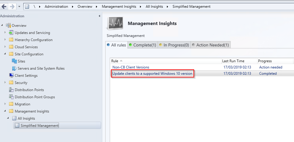 Management insights is becoming a very interesting area for Configuration Manager as Microsoft seek to leverage their significant investments in data analytics and artificial intelligence. The additions here further enhance the offering from previous versions by creating more rules around recommended use of collections – a key area for performance sapping – and further rules around Windows 10 devices that are at or coming to (within 3 months) the end of their supported lifecycle.
