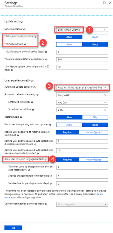 - Choose your feature update channel from Windows Insider through to Semi-Annual Channel. I’m expecting these names to change at some point as Microsoft start to drop the “targeted” labelling in places. To be clear, by opting in to WUfB you are also opting into using this for Feature updates from version to version. This will scare many people, but be aware that Microsoft are getting better with these updates version by version in terms of size of update, speed of install, amount of offline time etc.