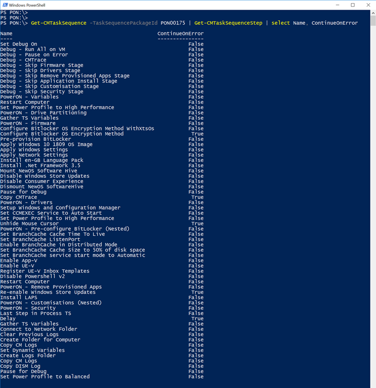 Get-CMTaskSequence –TaskSequencePackageId <PACKAGE ID> | Get-CMTaskSequenceStep | select Name, ContinueOnError