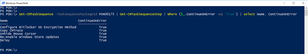 Get-CMTaskSequence –TaskSequencePackageId <PACKAGE ID> | Get-CMTaskSequenceStep | Where {$_.ContinueOnError -eq 'True'} | select Name, ContinueOnError