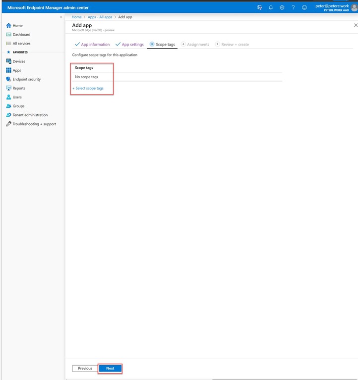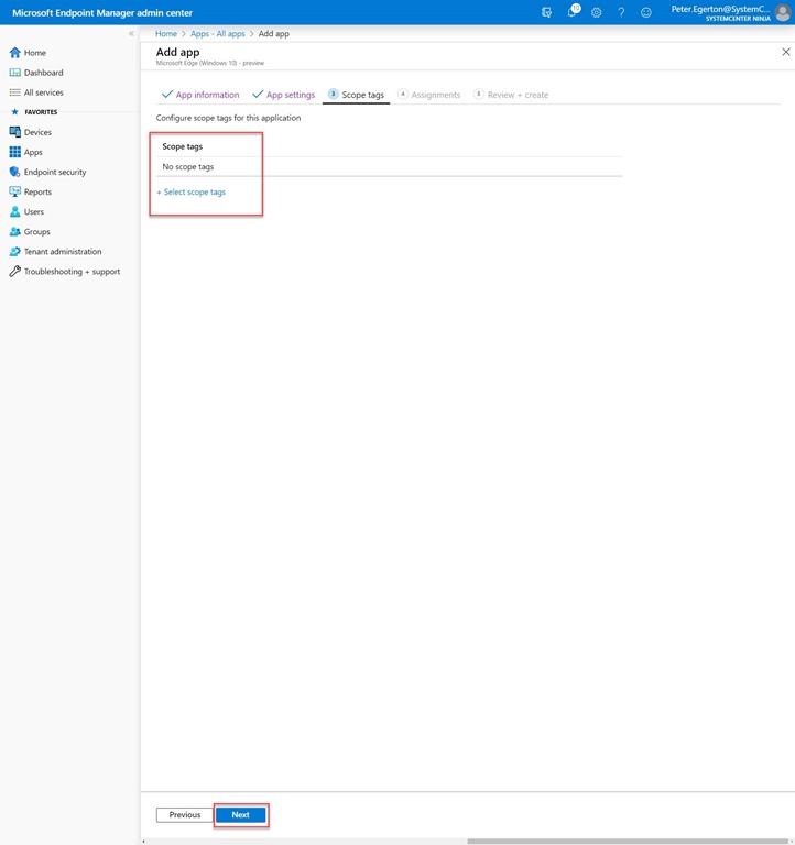 Now you can add any scope tags you may need for this deployment. This will allow you to control who can work with this specific application deployment based on the scopes they can work with.