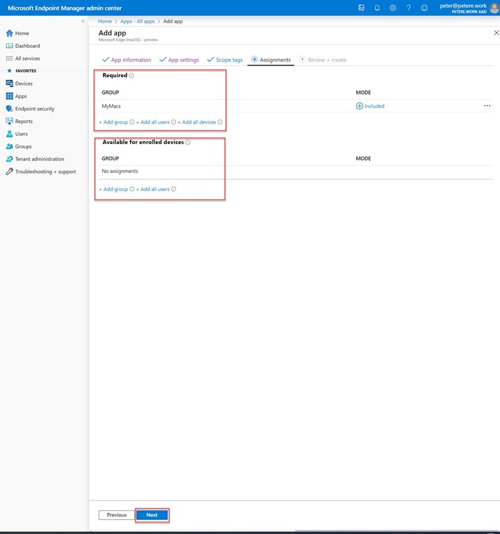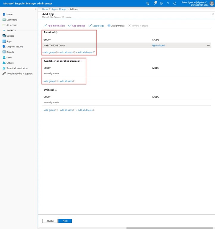 Next you can add the groups that the application will be required for or made available to. Be clear that if you want to make it available, you need to use a user group and the device they are using has to be enrolled. In that scenario the application will show in the company portal.