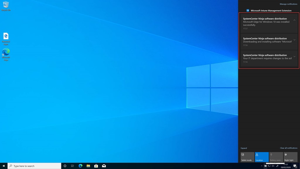 On my test device which is a member of that group, I didn’t have Company Portal installed but the deployment still kicked in and there are some notifications that pop up and can be seen in the action center.