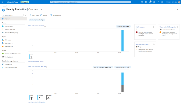 Microsoft Identity Protection in a nutshell is a tool used in combination with Azure Active Directory (AAD) to learn and report about user accounts and their sign-ins that are deemed to be ‘risky’ in some way. Not only that, the system can remediate certain risks and of course enable reporting on this. There are a number of criteria that are determined to identify what qualifies as a risky sign in, not all will be clear to you but they are based on Microsoft’s experience with massive amounts of data and signals from things like Azure AD, Microsoft (public) accounts and Xbox.