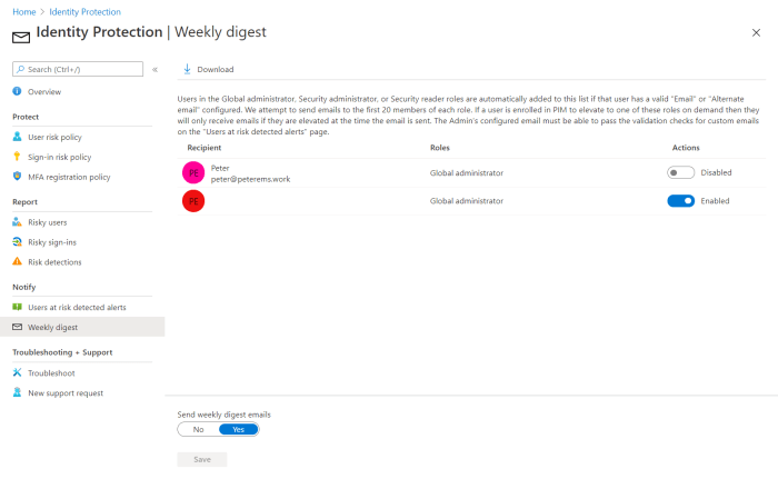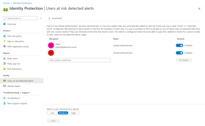 You have the option to add your own email addresses in this list too. Typically this might be a service desk or group mailbox etc. You should also set the level of risk that you want notifying for. This again may be a case of trial and error as each organisation may trigger risks in slightly different ways. That said, you most likely want to know of risk detection regardless so combining this with a daily check etc is a good idea.