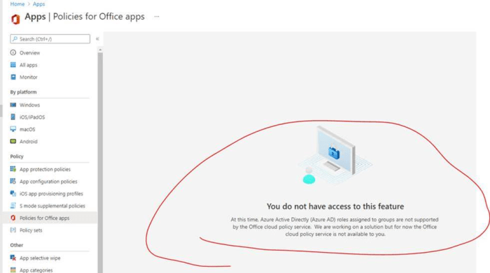 And here is where the clue comes. In order to manage Office Policy, Microsoft docs say you need to have ONE OF these permissions: